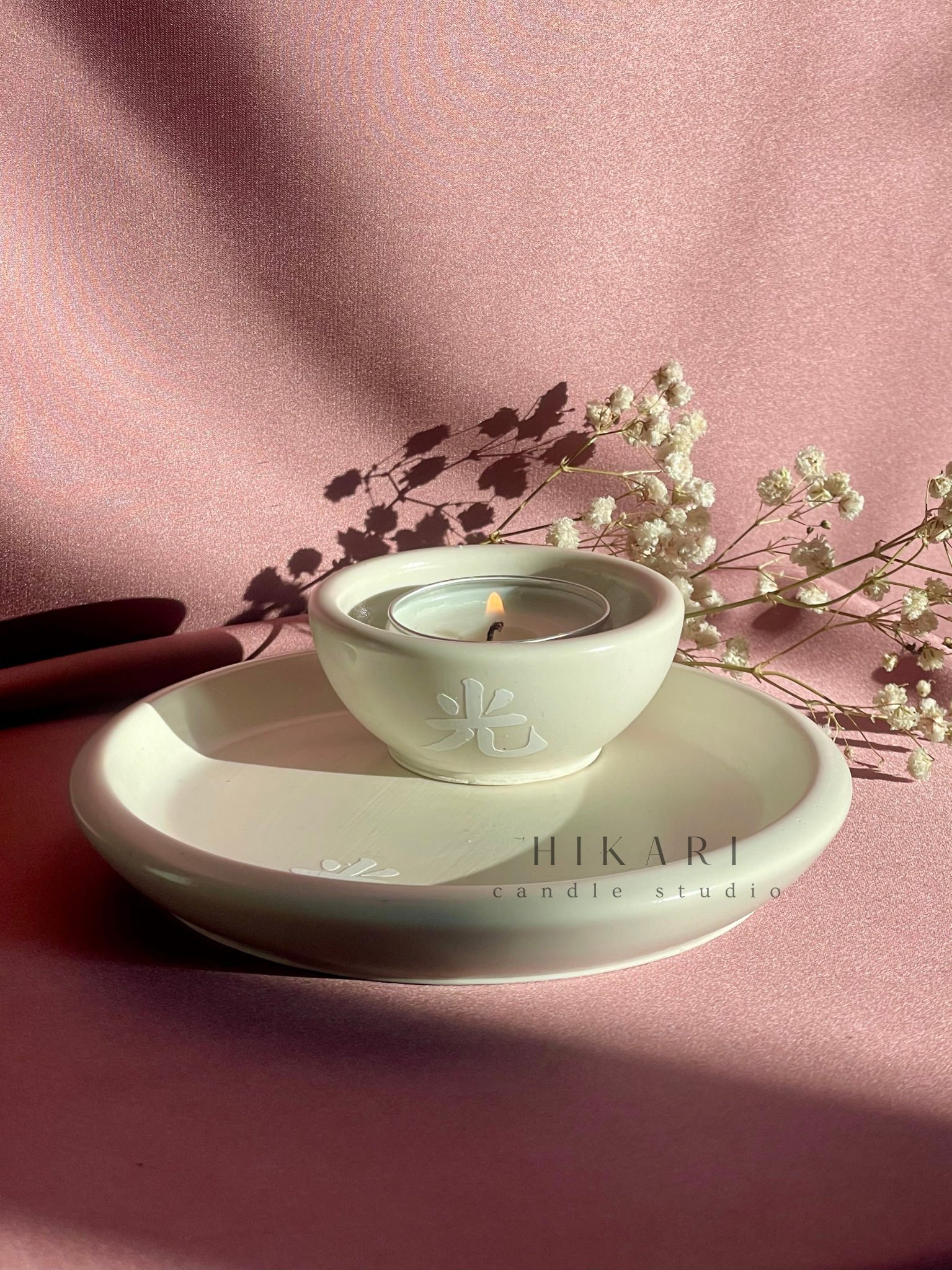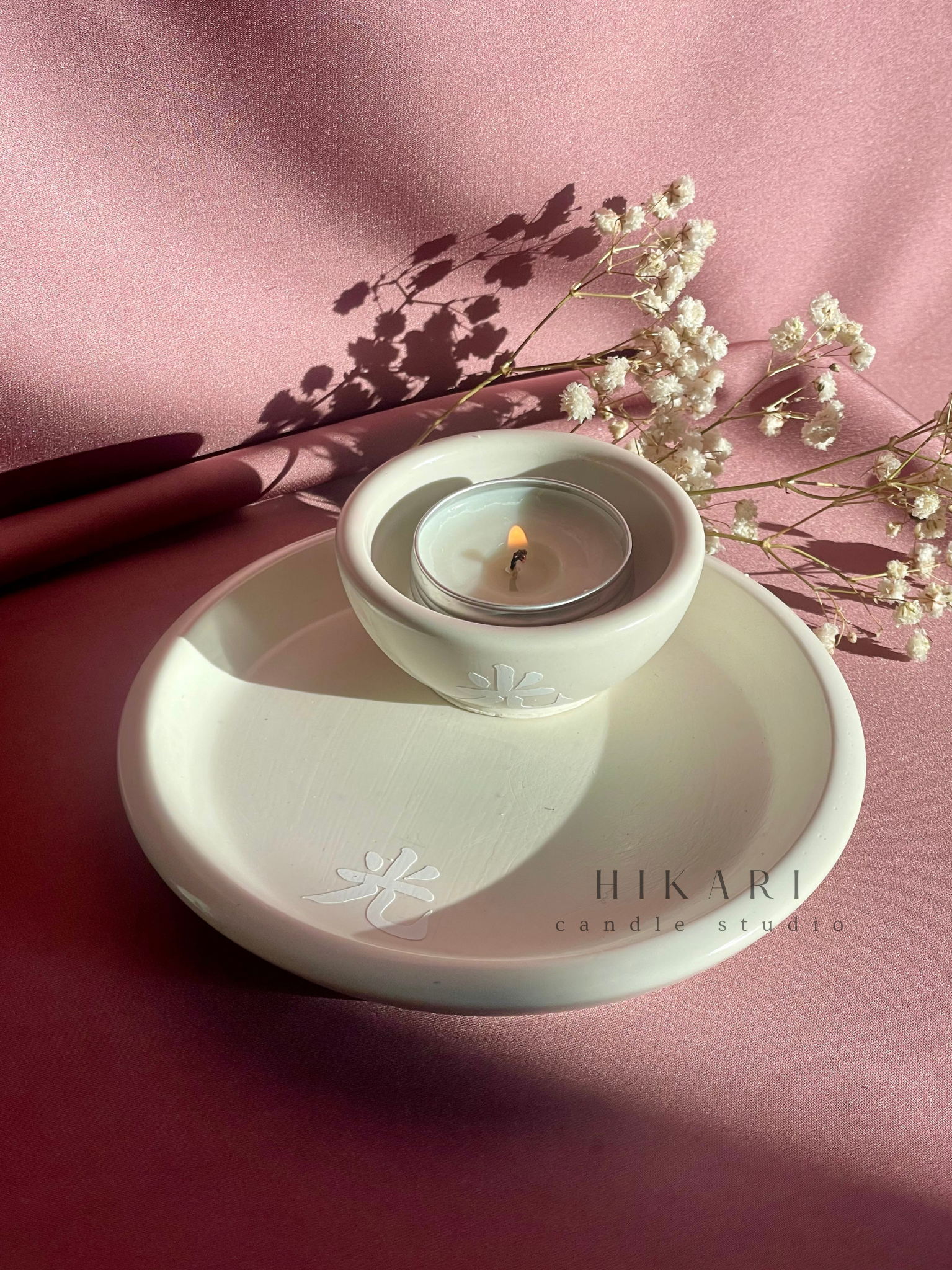 Para uma experiência completa, oferecemos a opção de um pack exclusivo, que inclui o prato, o suporte para tealight e uma tealight fragrância à sua escolha. Personalize o seu ambiente com aromas delicados, que realçam a suavidade e serenidade do conjunto, criando uma atmosfera perfeita para relaxar, revitalizar ou acolher.