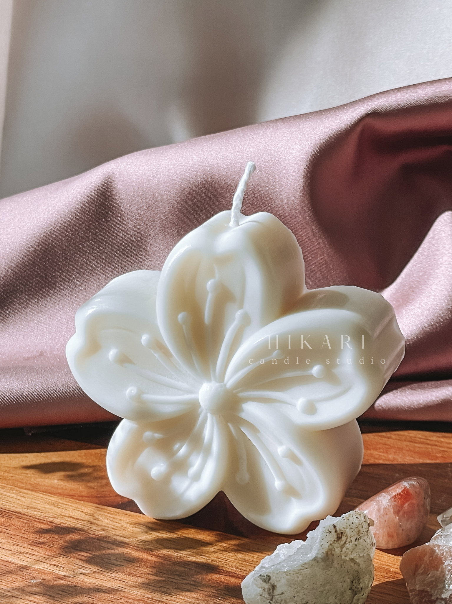 Inspirada na beleza efémera da flor de cerejeira, a vela Sakura 桜 é uma peça decorativa feita à mão em cera 100% natural de coco e colza, criada para trazer leveza, poesia e um toque de primavera ao espaço.