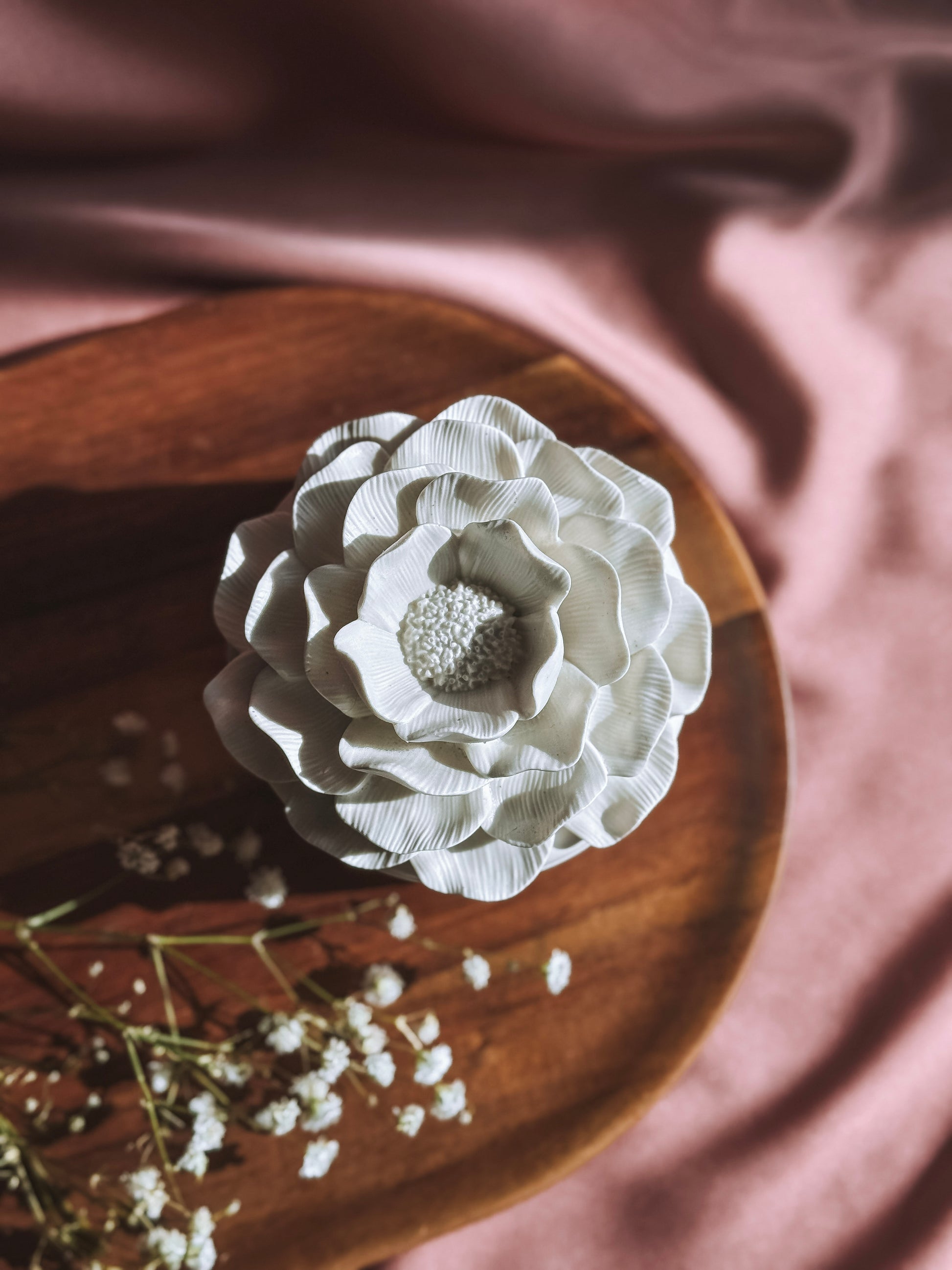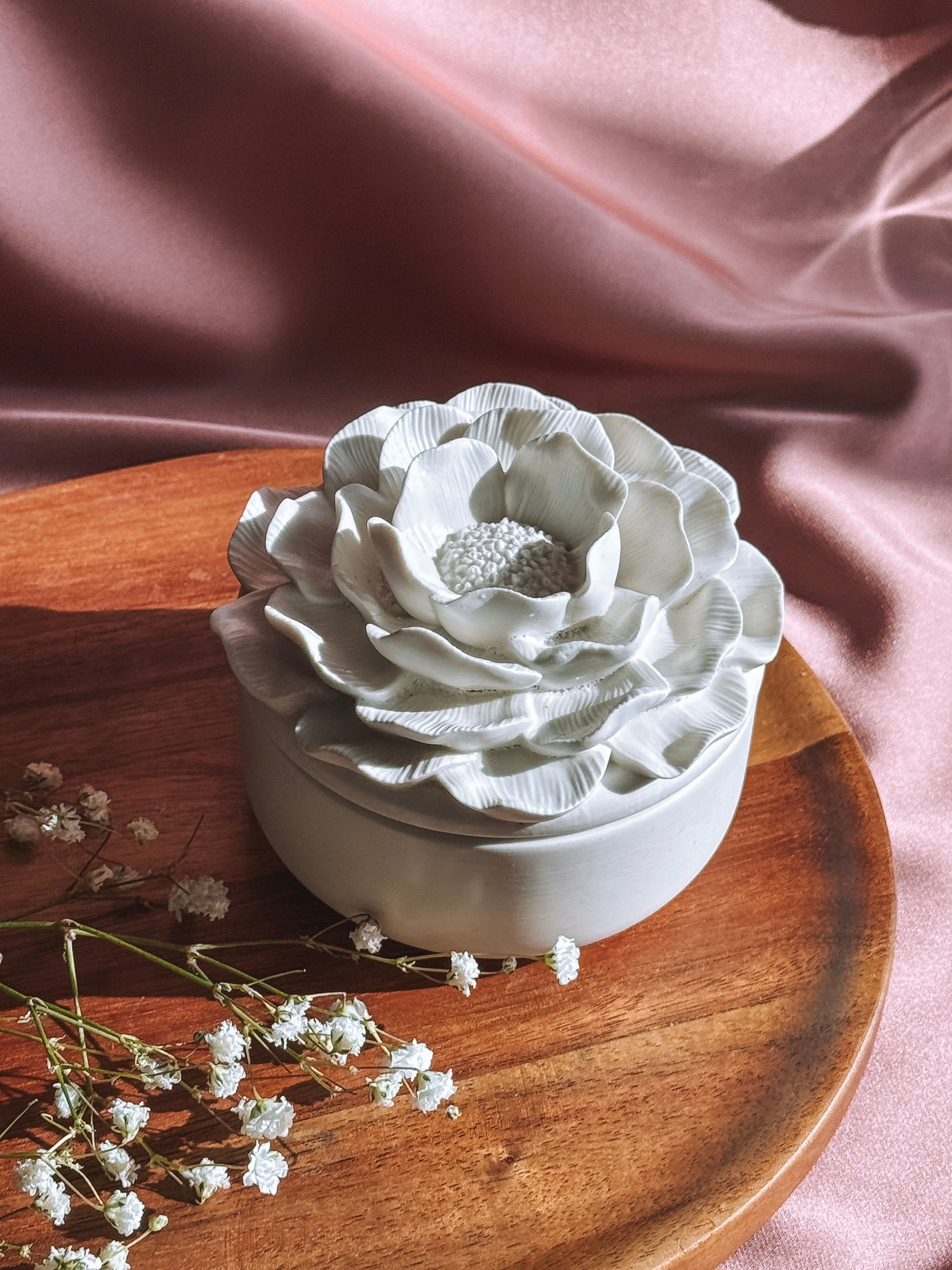 A sua tampa em forma de flor transforma-a numa peça escultórica, pensada para permanecer visível mesmo quando não está acesa.